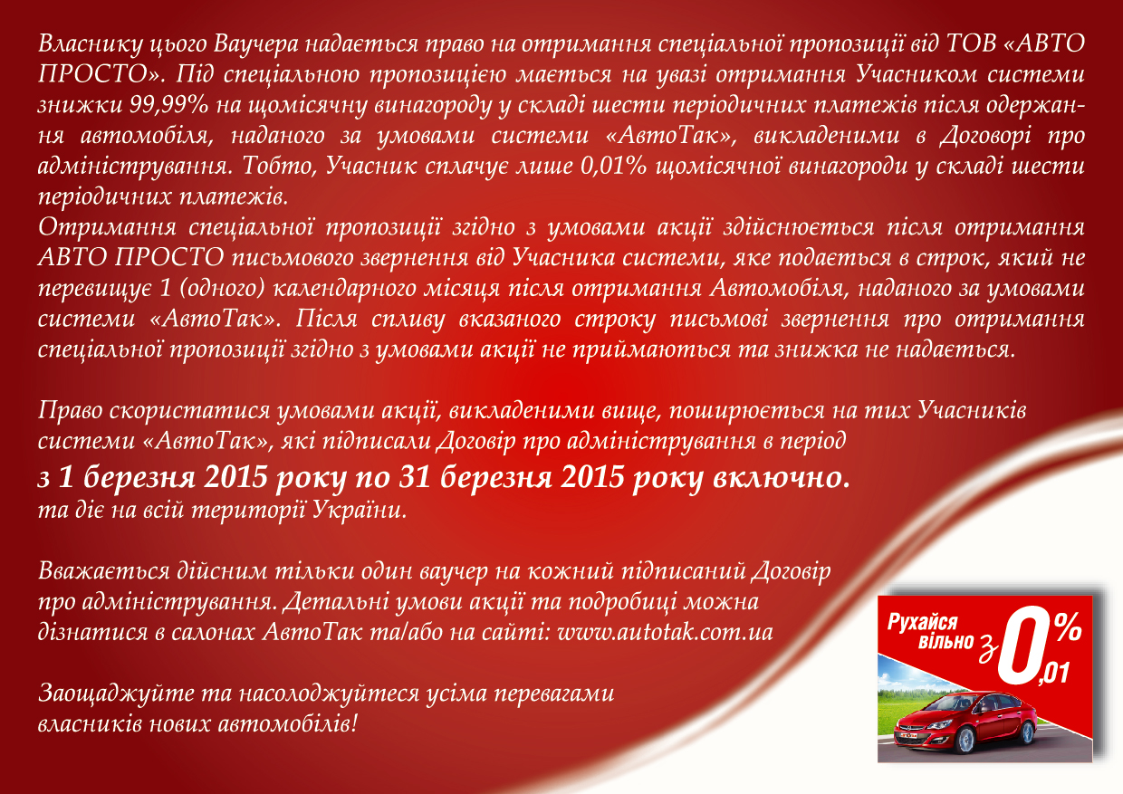 Право воспользоваться условиями акции, изложенными выше, распространяется на тех участников системы «АвтоТак», которые подписали Договор об администрировании в период с 01 марта по 30 апреля 2015 года включительно, и действует на всей территории Украины. Считается действительным только один ваучер на каждый подписанный Договор об администрировании.